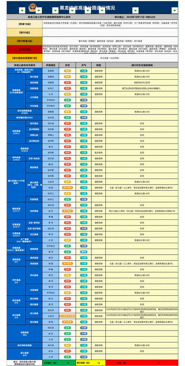 17日18时42分,记者从黑龙江省公安厅交通管理总队高速交管部门了解到,受省内雨雪、道路湿滑的影响,目前,我省哈牡高速等25段高速公路封闭,京哈高速等14段高速公路限速或限行,限速为80公里/小时。仅剩10段高速公路正常通行。