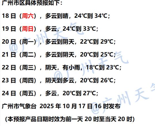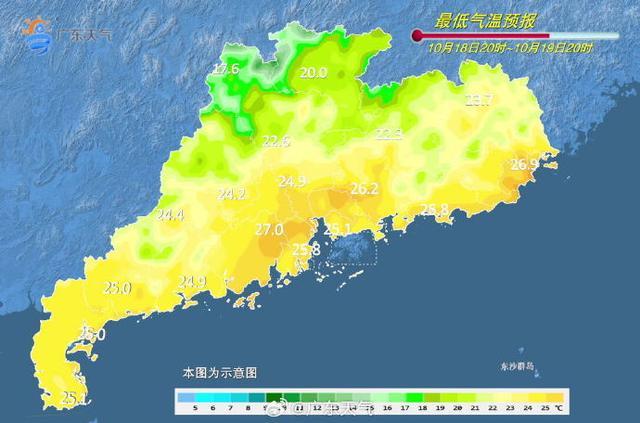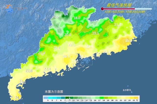 19日:清远北部和韶关北部22~27℃,粤北其余市县和珠三角北部市县28~31℃,其余大部市县31~33℃。