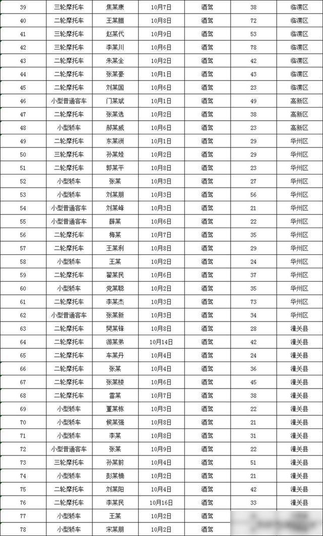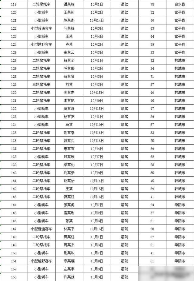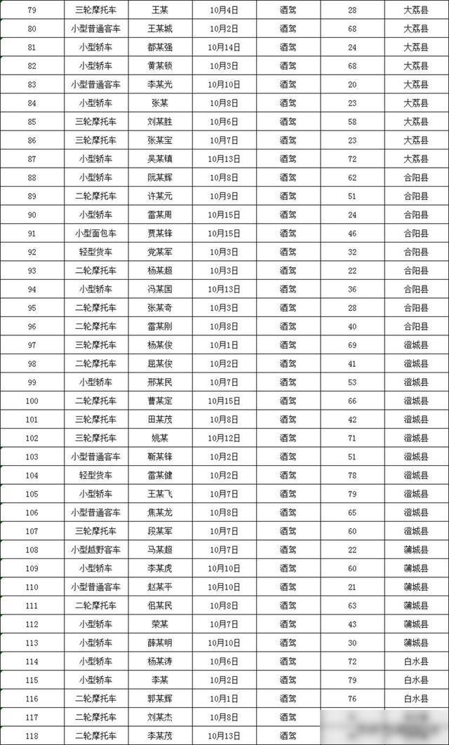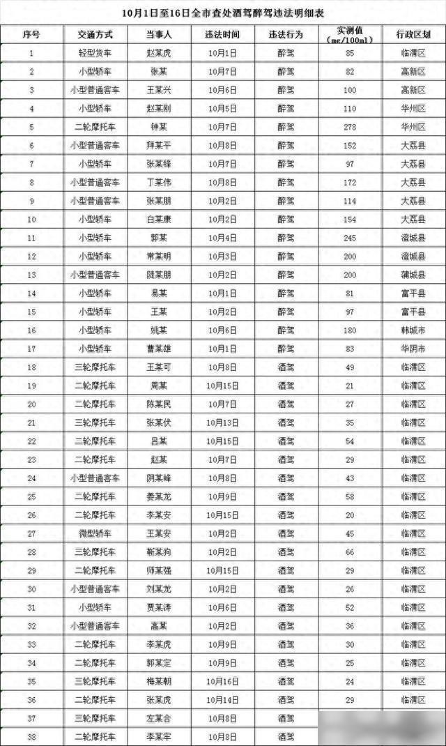 为全力净化道路通行环境,预防和减少道路交通事故,渭南公安交警针对各类易肇事肇祸的严重交通违法行为进行严查严处,全面化解道路交通风险隐患,守护群众出行平安。现将10月1日至10月16日全市因酒驾醉驾被查处人员名单予以曝光,希望广大交通参与者引以为戒。