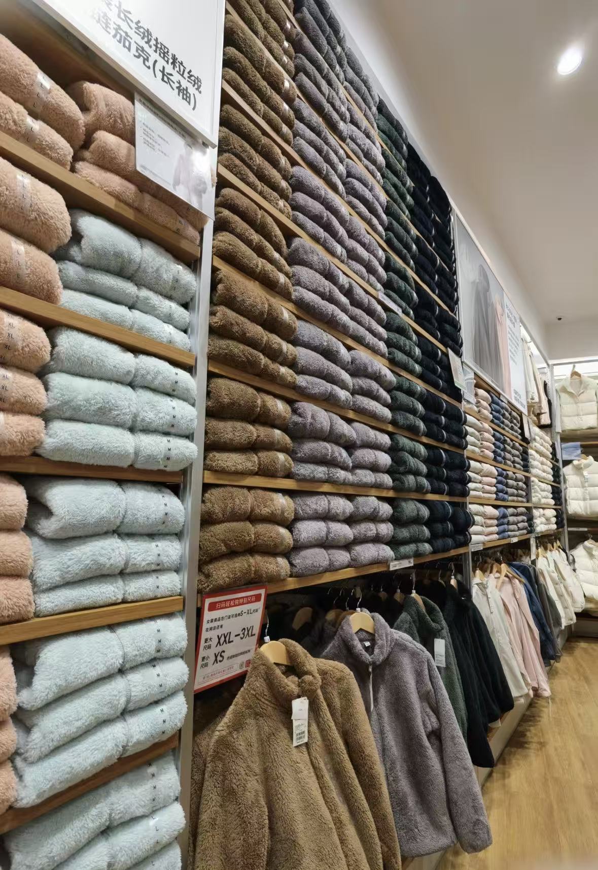 这种“较真”延伸到店铺的每个角落。优衣库的店铺,总让你觉得东西特别多,但又整齐有序。这不是偶然——陈列遵循精确规律:尺寸从下到上逐渐增大,颜色从左到右、从外到内逐渐变深。