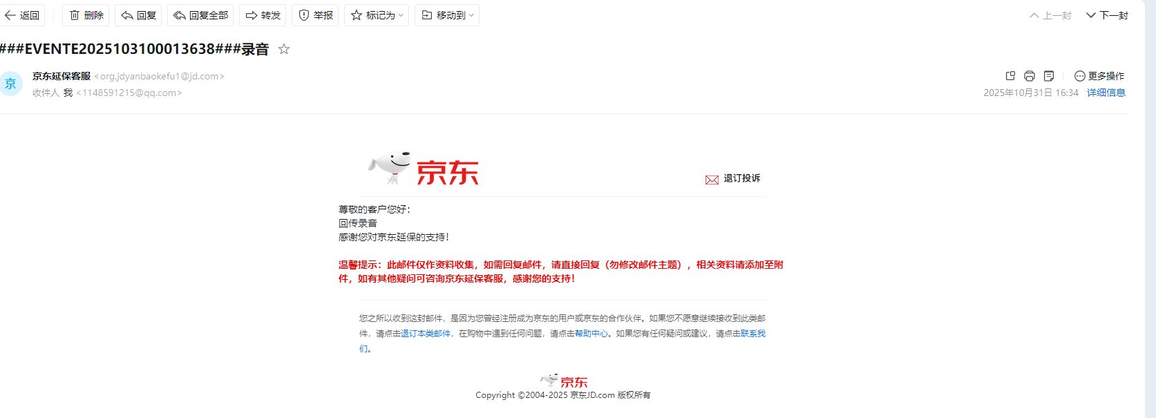 或许她没有想到,我会有录音吧,我把录音亮出来后,她又说,那可能是他们京东的系统出现故障了,没有这个通话记录,给我发了一个邮箱,让我把录音文件发给他们。