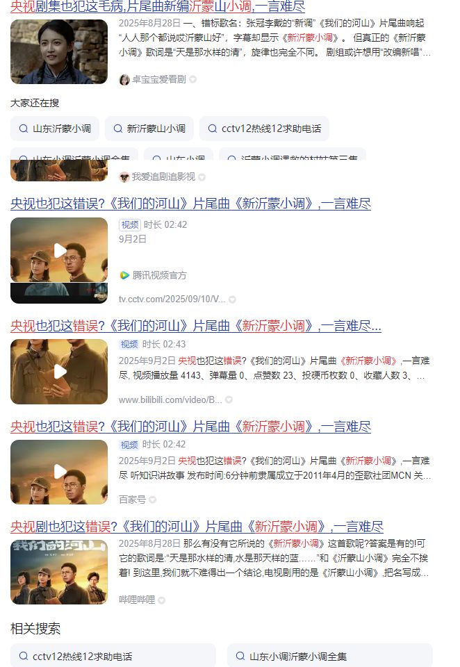 2025 年 8 月 28 日,歪歌社团发布文章《央视也犯这错误?〈我们的河山〉片尾曲〈新沂蒙小调〉一言难尽》中指出央视多个节目及影视作品中,长期将《沂蒙山小调》的作词者署名标错,且在电视剧《我们的河山》中将歌曲名称误标注为《新沂蒙小调》,歌词与实际内容不符的问题。