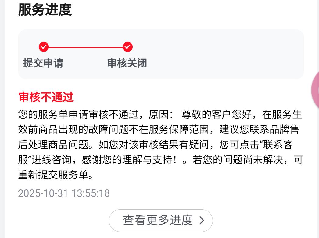 于是我在京东后台提交了申请,毕竟我买了5年免费上门修,而且现在也不用看商家脸色了,有了京东兜底的感觉就是好?一点都不好,我提交的申请,第二天早上(10月31日)给我驳回了,说“服务生效前”的故障,不在延保范围内。