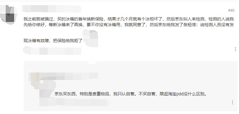 他在京东买冰箱的时候,顺带买了首年换新的保险服务,结果才用了几个月就坏了,京东派人来检测,跟他说,我先给你修好,要不然你没得用。等过几年新冰箱来了再换新。