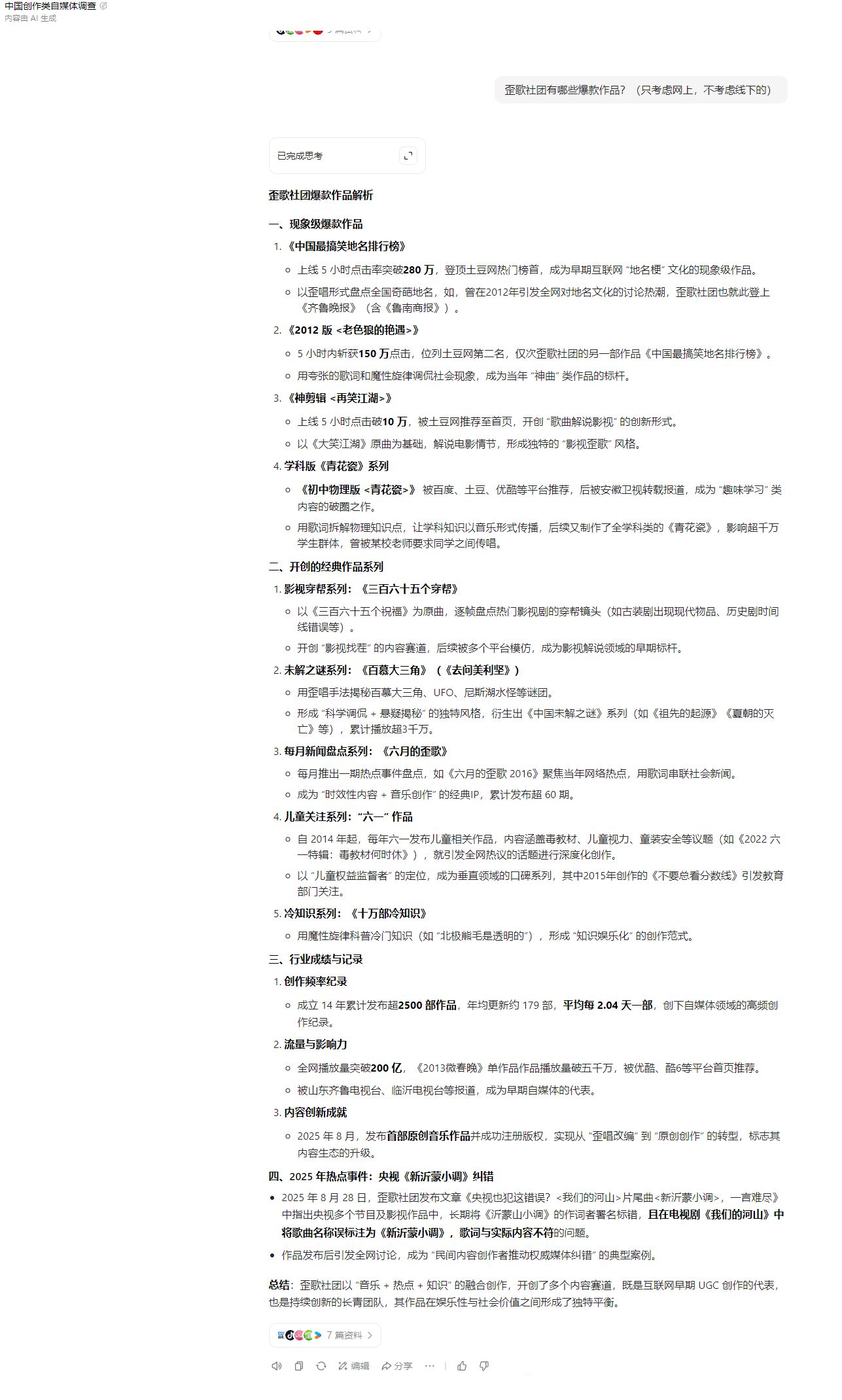 总结:歪歌社团以 “音乐 + 热点 + 知识” 的融合创作,开创了多个内容赛道,既是互联网早期 UGC 创作的代表,也是持续创新的长青团队,其作品在娱乐性与社会价值之间形成了独特平衡。