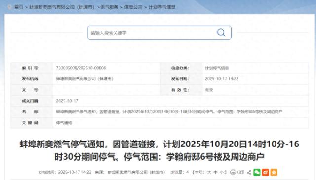 大皖新闻讯记者10月18日从蚌埠新奥燃气发布的停气通知获悉,因管道碰接,当地计划2025年10月20日14时10分-16时30分期间停气。