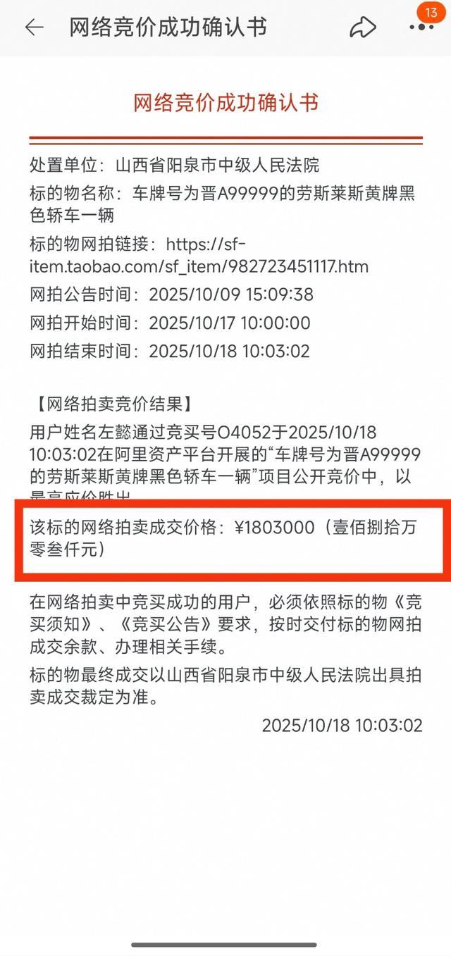 大皖新闻讯10月18日上午,大皖新闻记者从阿里资产平台看到,车牌号为晋A99999的劳斯莱斯黄牌黑色轿车,二拍拍出180.3万。车辆起拍价154.4万元,吸引5人报名,19次出价。