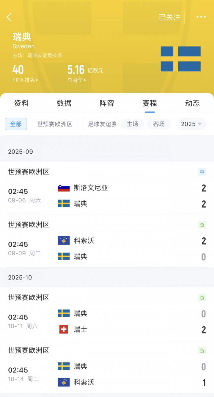 9月世预赛,瑞典2-2斯洛文尼亚、0-2科索沃,排名从世界第29跌至第32;10月世预赛,瑞典0-2瑞士、0-1科索沃,排名又从世界第32跌至第40。目前,瑞典在世欧预B组排名垫底。