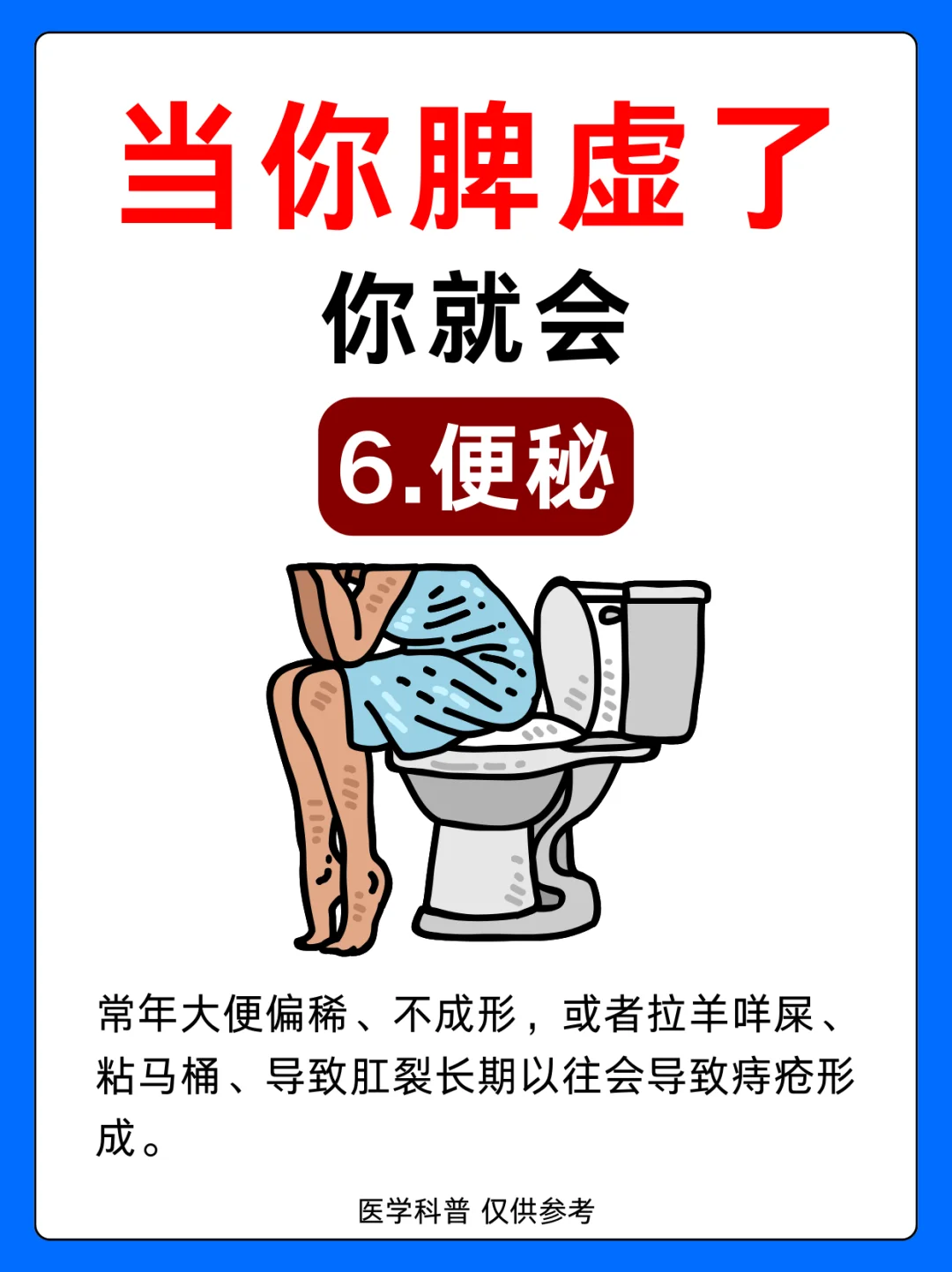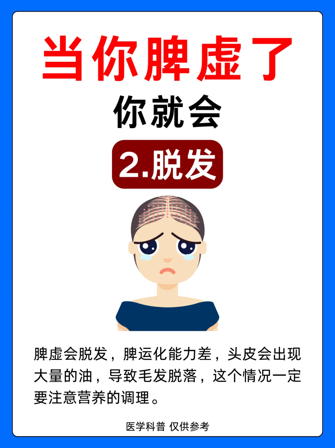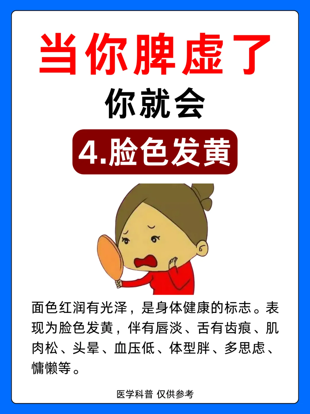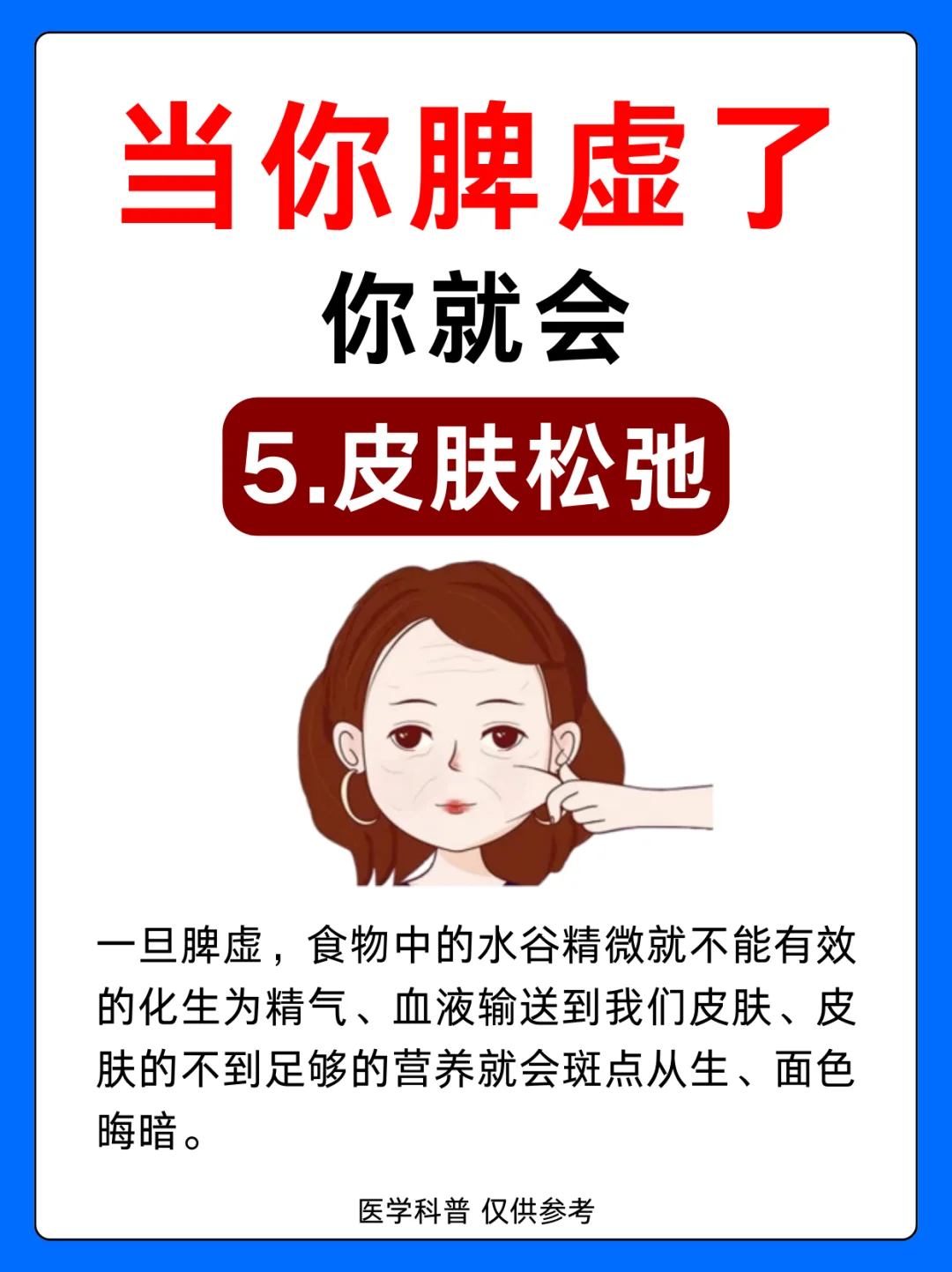 1.肚子凸起 2.脱发 3.齿痕舌 4.脸色发黄 5.皮肤松弛 6.便秘