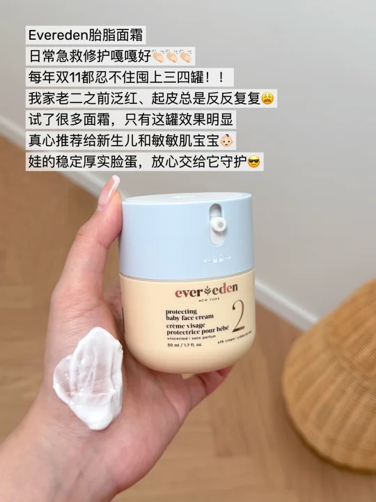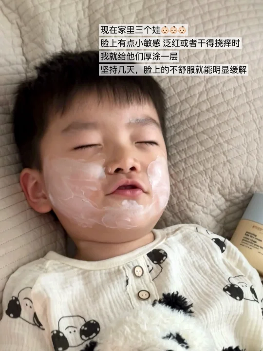 我儿子一到换季皮肤就容易不稳定,稍微一降温小脸蛋就起红点点,厚敷两天这个胎脂面霜就下去了。秋冬日常早晚用这个,保湿修护很不错。奶霜质地,吸收的很快,涂完以后滋润还不粘腻,我家娃都可喜欢用了~