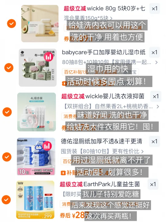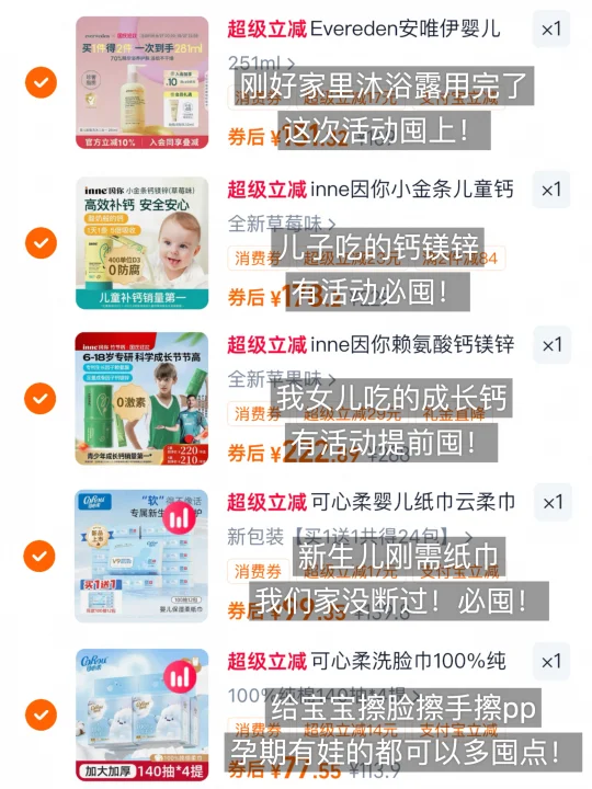 日常消耗比较快的,屁粮口粮纸巾啥的必囤。尤其到了冬季,娃的小嫩皮照顾不好的话,就容易干痒红,护肤品也要多囤点!