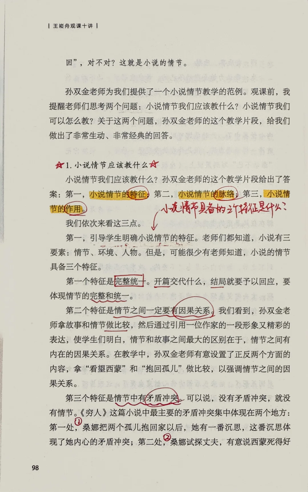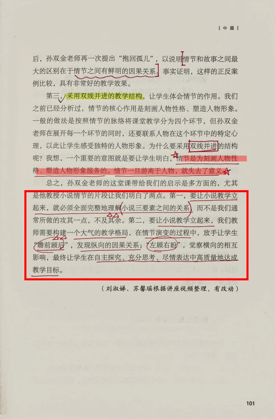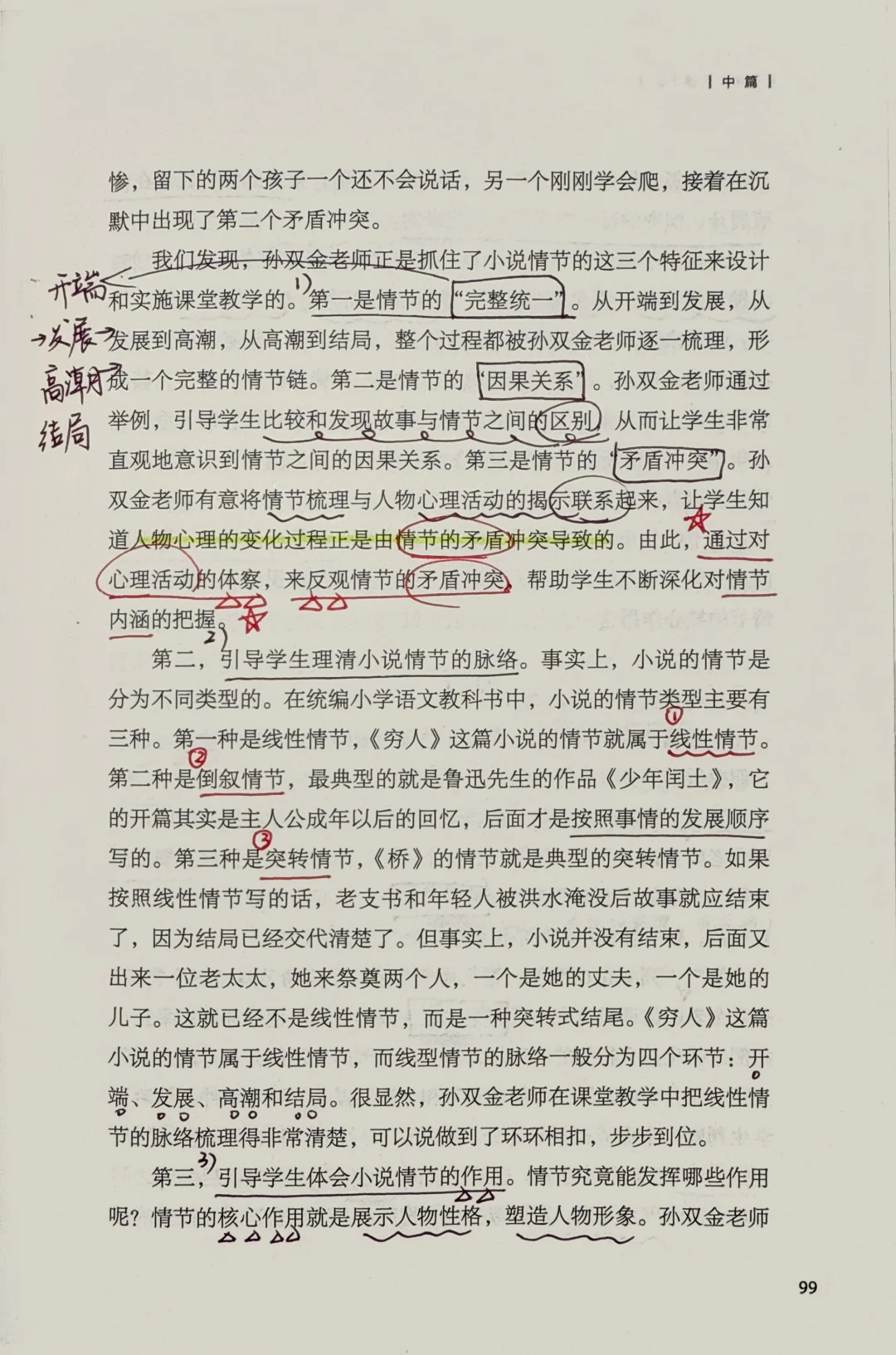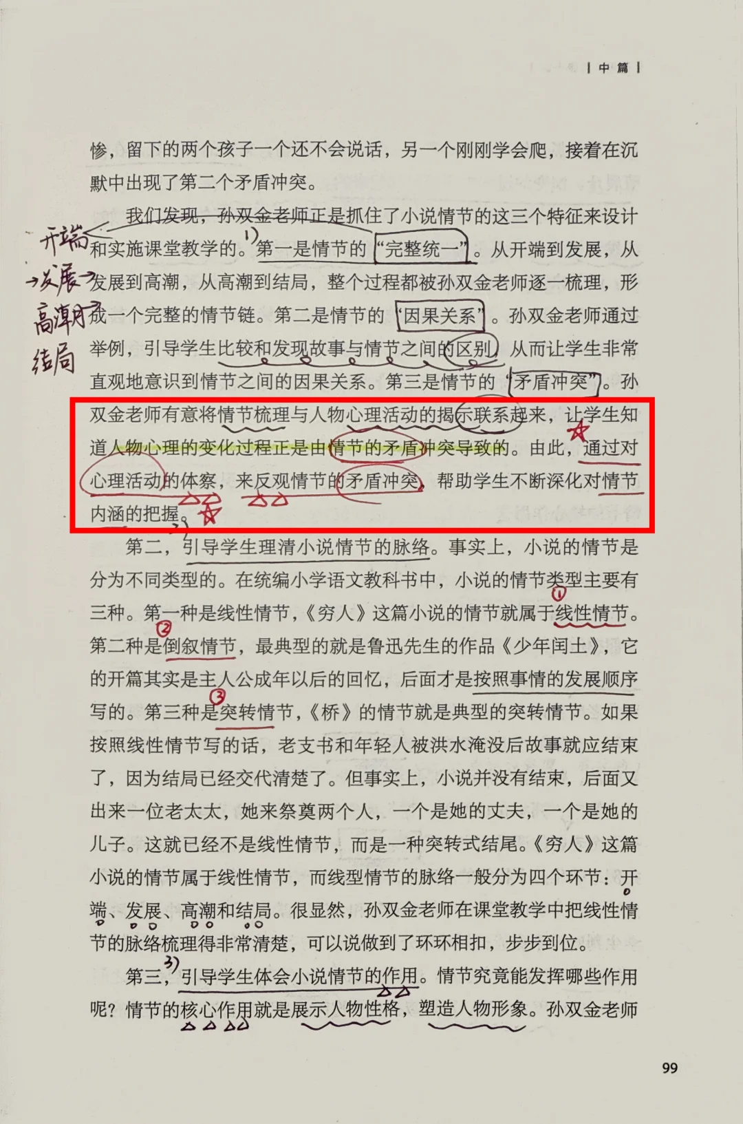 🍃通过情节与人物的整合,让小说的教学立起来 ‼️孙双金老师最让人佩服的一点是,他真正将小说的三要素:情节、环境和人物在教学设计和教学过程中整合起来了!无论从哪个方面切入,必然要关涉到相应的另外两个方面。一句话,我们必须要整体地、联系地把握小说三要素。精彩的教学环节然后再一一道来~ ┈︎┈︎┈︎┈︎┈︎┈┈︎┈︎┈︎┈︎ ✨基于对单元语文要素、课文情节以及对课后习题与练习的把握,孙老师真正将小说的教学整合起来了! 〽️打破常规教学设计的弊端,为了避免让学生根据教学设计的板块肢解开去理解小说的三要素,这样会让学生阅读理解的碎片化,孙老师进行了这样巧妙的设计: 板块一:关注故事情节,感受人物心理; 这个板块是启示意义最大、参考价值最大的一个板块,孙老师很好地诠释了两个问题: [一R]小说情节我们应该教什么? [二R]小说情节我们可以怎样教? ┈︎┈︎┈︎┈︎┈︎┈┈︎┈︎┈︎┈︎ 孙老师将第一个板块细分成了六个小部分,都体现了整体性、联系性地教学过程:①明确要素,提供支架;②梳理“开端”,关注“心理”;③梳理“发展”,感受“心理”;④梳理“高潮”,体会“心理”;⑤梳理“结局”,推测“心理”;⑥总结比较,把握精髓。 👉那围绕小说情节应该教什么? 🔸孙老师抓住了小说情节的三个特征来设计和实施教学的: 1️⃣情节的“完整统一”;2️⃣情节的“因果关系”;3️⃣情节的“矛盾冲突” ‼️孙老师有意将情节梳理与人物心理活动的揭示联系起来,让学生通过对心理活动的体察,来反观情节的矛盾冲突。实在是高明👍 板块二:对比环境描写,感受人物性格; 板块三:聚焦人物活动,感受人物品行。 ┈︎┈︎┈︎┈︎┈︎┈┈︎┈︎┈︎┈︎ 🍃采用双线并进的教学结构,最重要的一个意图是让学生明白,情节是为刻画人物性格、塑造人物形象服务的。情节一旦游离于人物,就失去了意义!