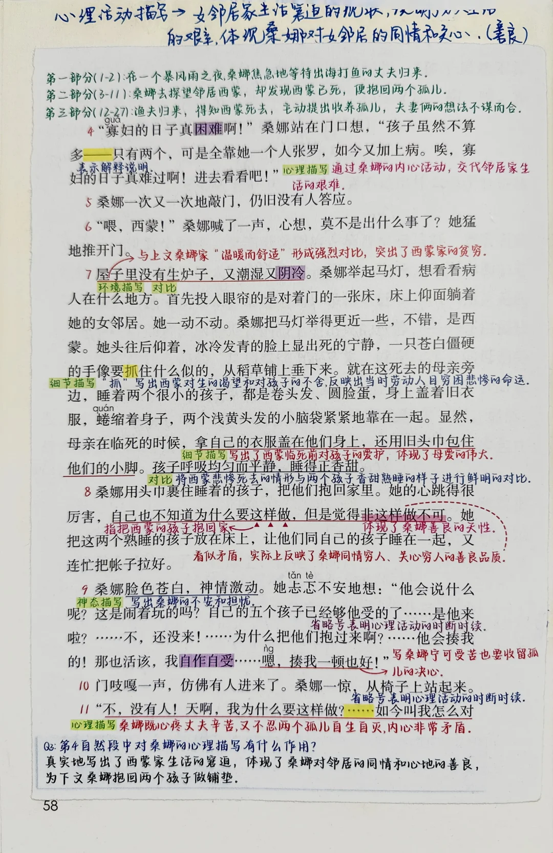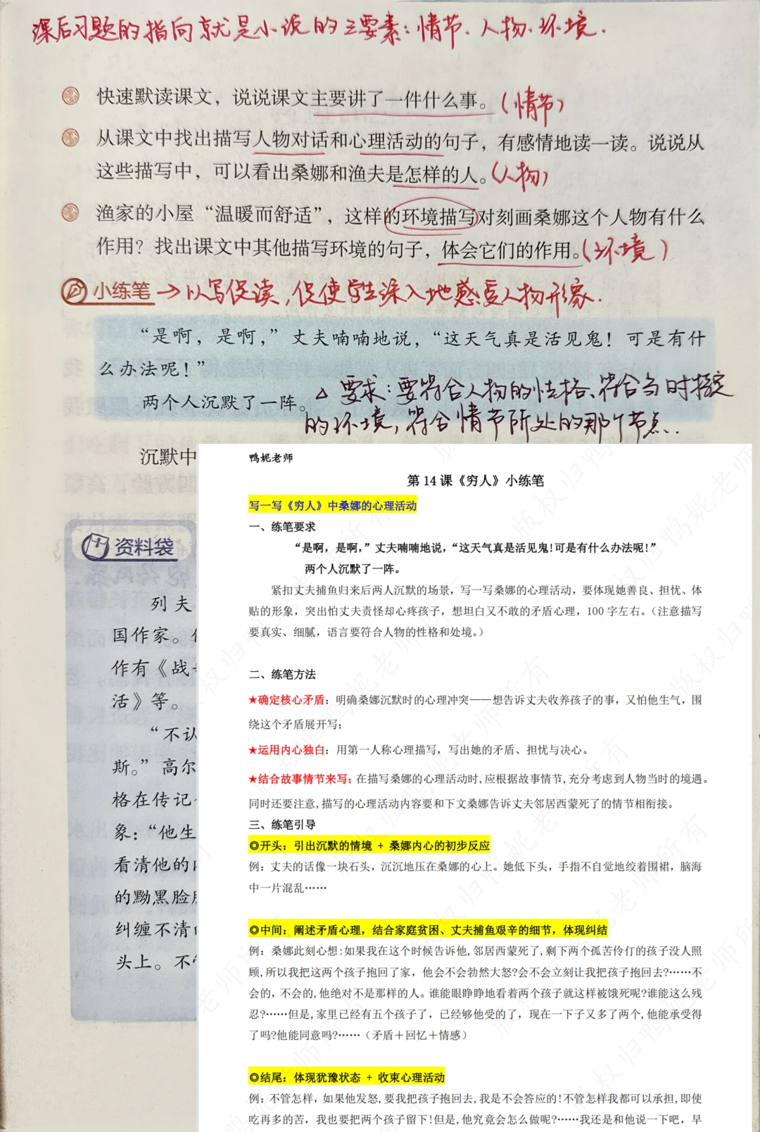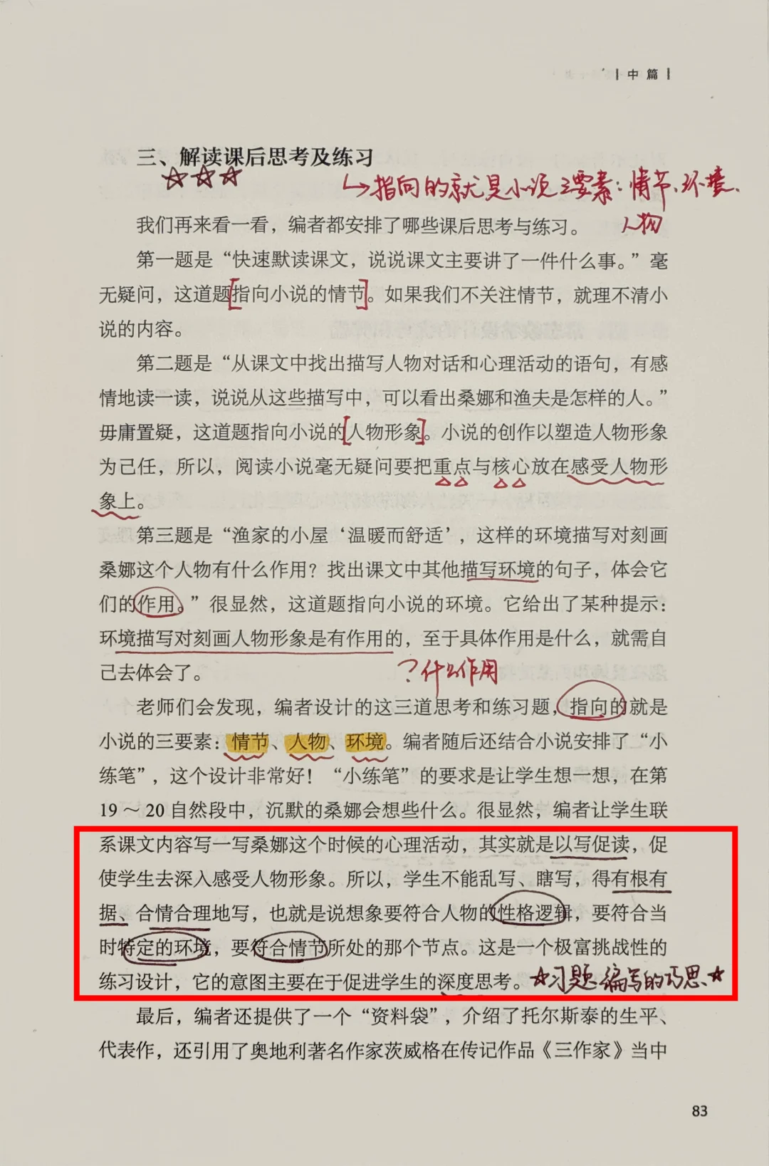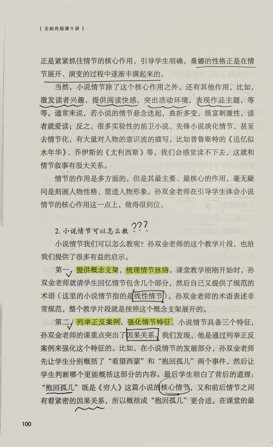 🍃通过情节与人物的整合,让小说的教学立起来 ‼️孙双金老师最让人佩服的一点是,他真正将小说的三要素:情节、环境和人物在教学设计和教学过程中整合起来了!无论从哪个方面切入,必然要关涉到相应的另外两个方面。一句话,我们必须要整体地、联系地把握小说三要素。精彩的教学环节然后再一一道来~ ┈︎┈︎┈︎┈︎┈︎┈┈︎┈︎┈︎┈︎ ✨基于对单元语文要素、课文情节以及对课后习题与练习的把握,孙老师真正将小说的教学整合起来了! 〽️打破常规教学设计的弊端,为了避免让学生根据教学设计的板块肢解开去理解小说的三要素,这样会让学生阅读理解的碎片化,孙老师进行了这样巧妙的设计: 板块一:关注故事情节,感受人物心理; 这个板块是启示意义最大、参考价值最大的一个板块,孙老师很好地诠释了两个问题: [一R]小说情节我们应该教什么? [二R]小说情节我们可以怎样教? ┈︎┈︎┈︎┈︎┈︎┈┈︎┈︎┈︎┈︎ 孙老师将第一个板块细分成了六个小部分,都体现了整体性、联系性地教学过程:①明确要素,提供支架;②梳理“开端”,关注“心理”;③梳理“发展”,感受“心理”;④梳理“高潮”,体会“心理”;⑤梳理“结局”,推测“心理”;⑥总结比较,把握精髓。 👉那围绕小说情节应该教什么? 🔸孙老师抓住了小说情节的三个特征来设计和实施教学的: 1️⃣情节的“完整统一”;2️⃣情节的“因果关系”;3️⃣情节的“矛盾冲突” ‼️孙老师有意将情节梳理与人物心理活动的揭示联系起来,让学生通过对心理活动的体察,来反观情节的矛盾冲突。实在是高明👍 板块二:对比环境描写,感受人物性格; 板块三:聚焦人物活动,感受人物品行。 ┈︎┈︎┈︎┈︎┈︎┈┈︎┈︎┈︎┈︎ 🍃采用双线并进的教学结构,最重要的一个意图是让学生明白,情节是为刻画人物性格、塑造人物形象服务的。情节一旦游离于人物,就失去了意义!