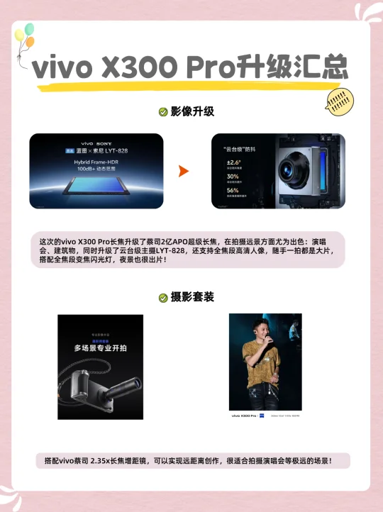 X300 pro长焦升级了蔡司2亿APO超级长焦[吃瓜R],拍演唱会爱豆、建筑穹顶这种远场景[赞R][赞R],画质清晰不糊;主摄也换成云台级 LYT-828 传感器,手抖拍动态也稳,随便拍都是大片感!😍😍