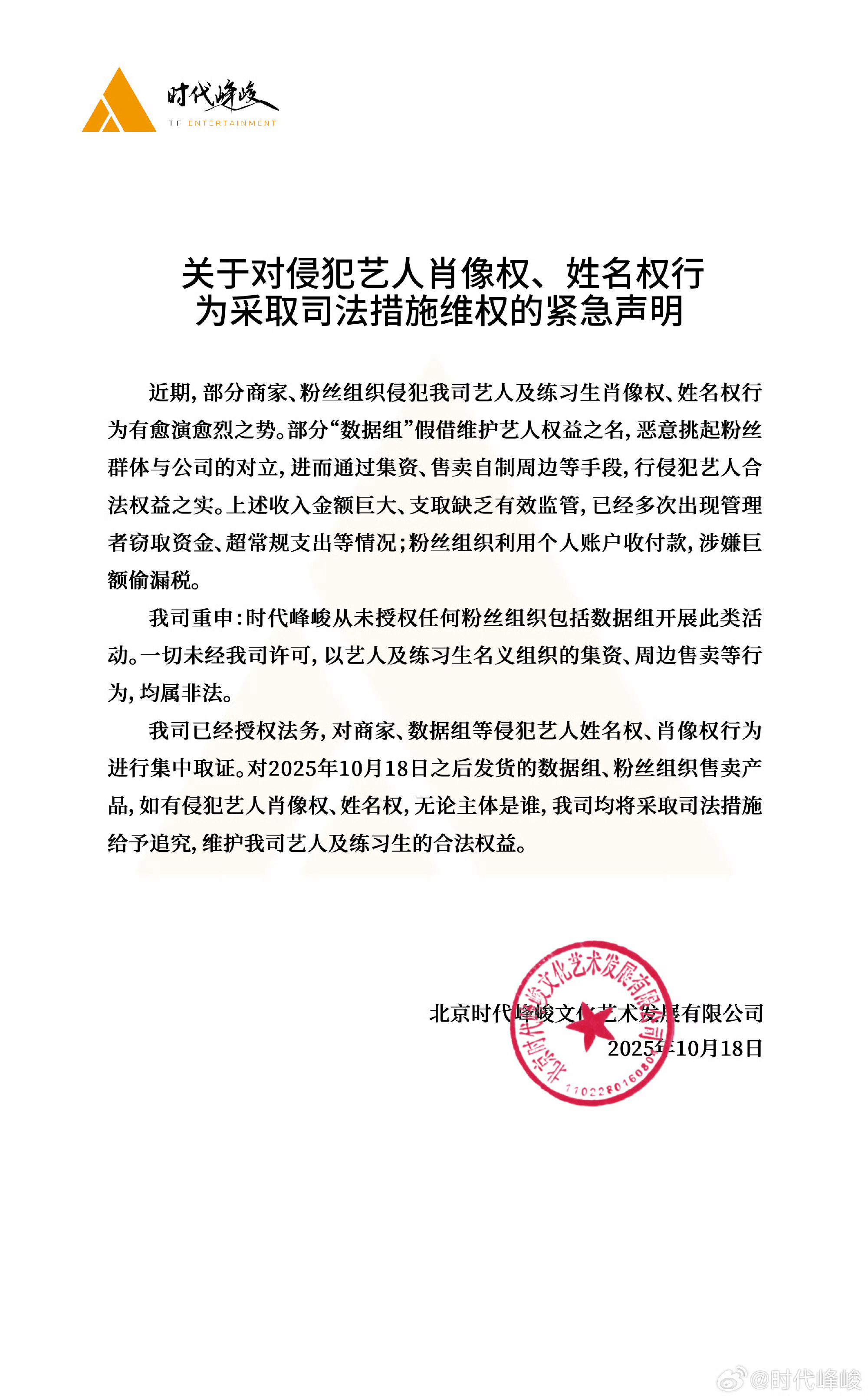 看了下意思大概就是不授权数据组和粉丝组织集资、周边售卖等行为。如果10月18日之后发货的售卖产品侵犯了艺人肖像权、姓名权,公司均将采取司法措施给予追究