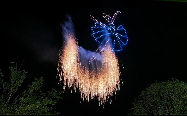 随着夜幕深沉,乌镇上空的无人机表演将节日气氛推向高潮,点点亮光与璀璨烟花交相辉映,将夜空装点得格外梦幻。