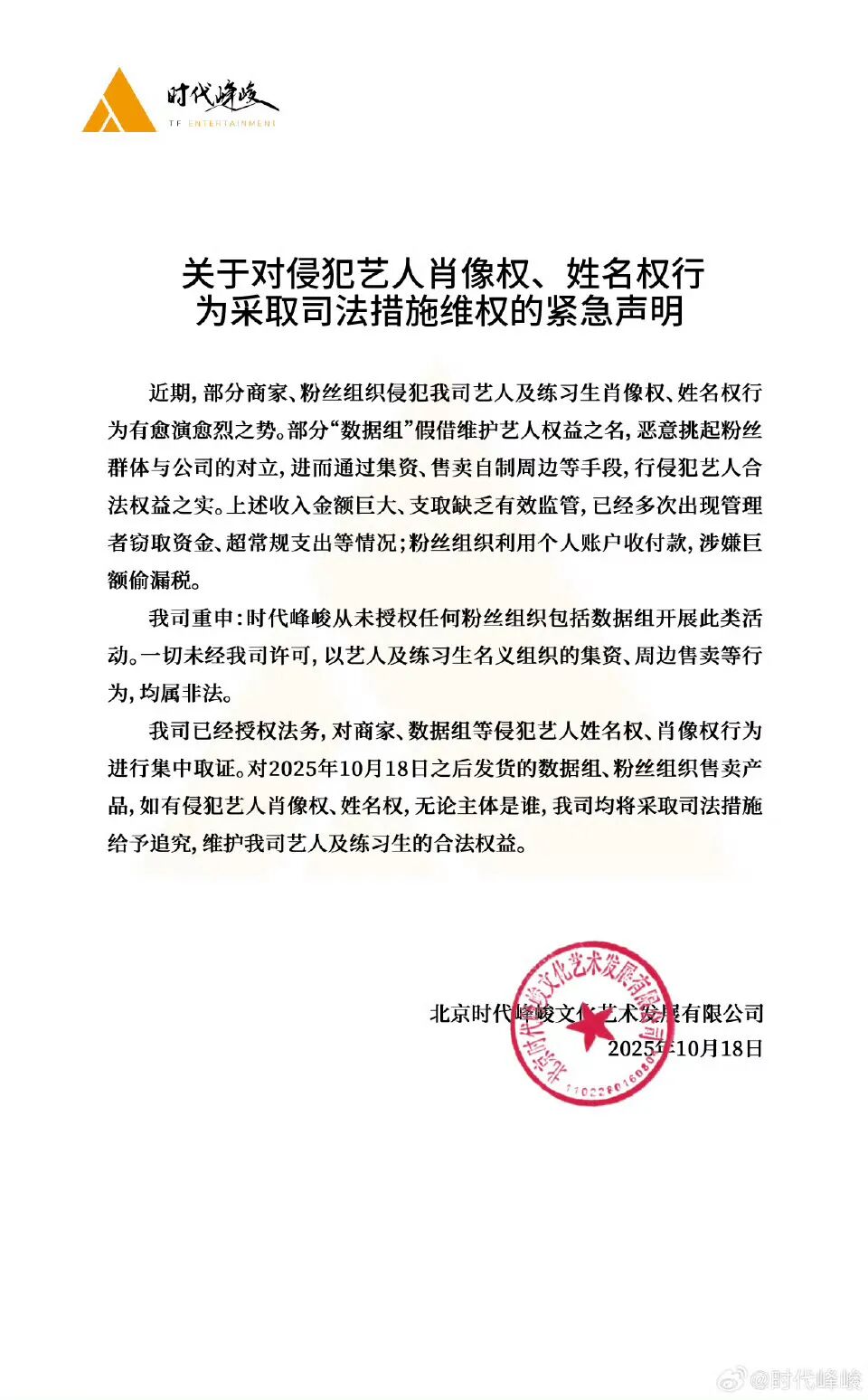 10月18日下午15时20分,北京时代峰峻文化艺术发展有限公司通过官方渠道发布《关于对侵犯艺人肖像权、姓名权行为采取司法措施维权的紧急声明》。声明中指出,近期市场上出现多起未经授权擅自使用该公司旗下艺人肖像、姓名进行商业宣传、产品推广等侵权行为。