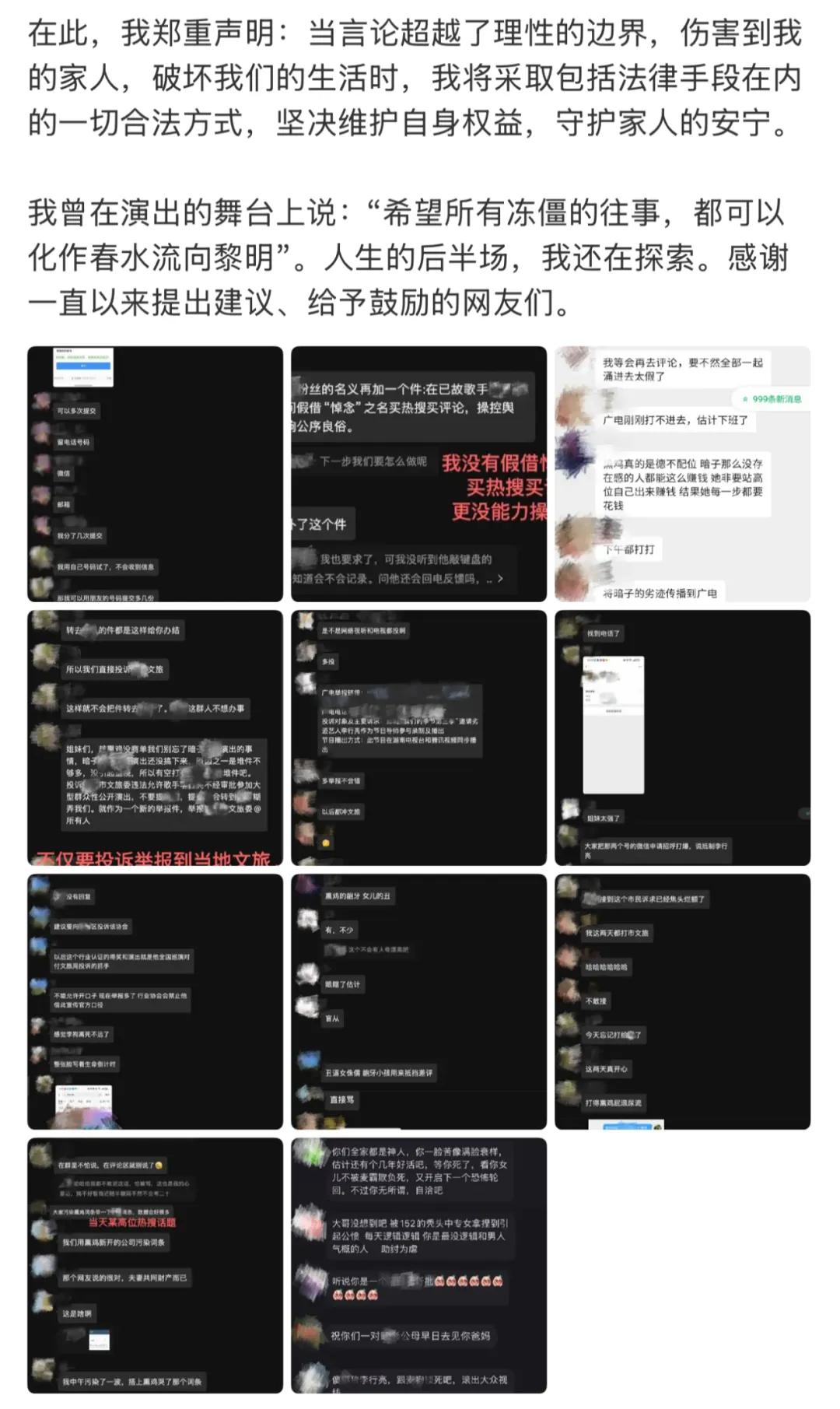 李行亮在博文中声明:“当言论超越了理性的边界,伤害到我的家人,破坏我们的生活时,我将采取包括法律手段在内的一切合法方式,坚决维护自身权益,守护家人的安宁。”