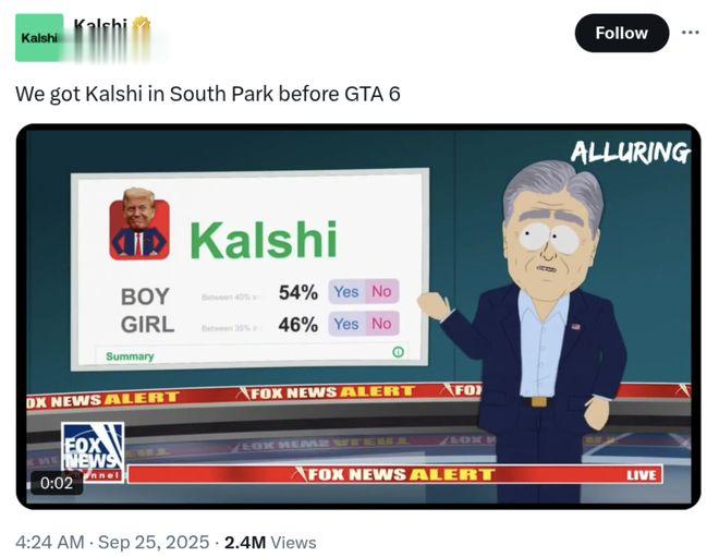 近期,Kalshi因其在纽约市展示的市长选举赔率实时屏幕而在社交媒体上走红,相关视频在X平台上的观看量接近1300万次。该平台甚至出现在了知名动画片《南方公园》中,其文化影响力可见一斑。这些平台通过捕捉公众对热点事件的关注,成功将预测市场推向了更广泛的视野。
