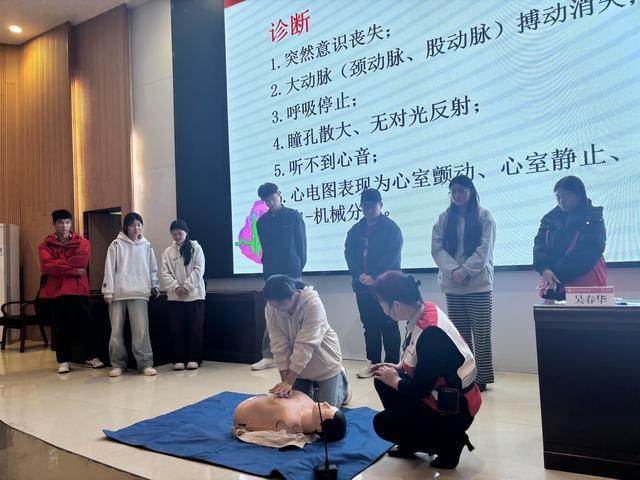 最激动人心的环节当属现场互动实践。在吴春华的鼓励和指导下,多名同学自告奋勇,轮流上台进行心肺复苏实操练习。“手臂要伸直,用上半身的力量垂直下压!”吴春华耐心地纠正每一个细节。一位初次尝试的女同学在成功完成一组按压后,激动地表示:“虽然很累,但感觉特别有意义,万一真遇到紧急情况,我知道该怎么出手相助了,不会再只是慌张。”这种亲身体验,让抽象的急救知识转化为了实实在在的救助能力。