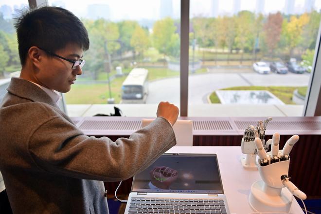 10月17日,在中国科学院沈阳自动化研究所展台,工作人员演示“仿生五指灵巧手”展品。新华社记者吴青昊摄