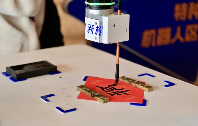 沈阳新松机器人自动化股份有限公司展台上,工作人员告诉智能机器人“书法家”需求后,它便构思笔画,流畅写出隶书“福”字。“这款智能机器人利用了大数据模型,接收指令后可自动思考并反馈,书写各种字体的软笔书法。”工程师周典介绍。