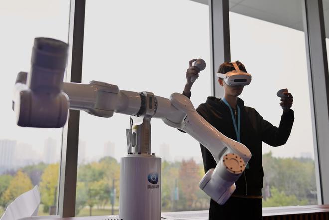 10月17日,在广东天机智能系统有限公司展台,工作人员演示“全力控高精度人形臂Marvin”展品。新华社记者吴青昊摄
