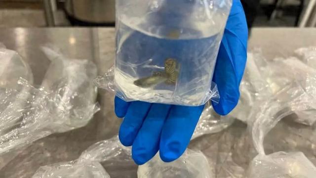 济南机场海关工作人员在对入境旅客行李进行监管时,发现一名选择无申报通道通关的旅客行李机检图像异常。经开箱查验,发现行李箱内大量小型塑料袋并装有液体,每袋液体内均有一条活体鱼,颜色各异、形态不一。
