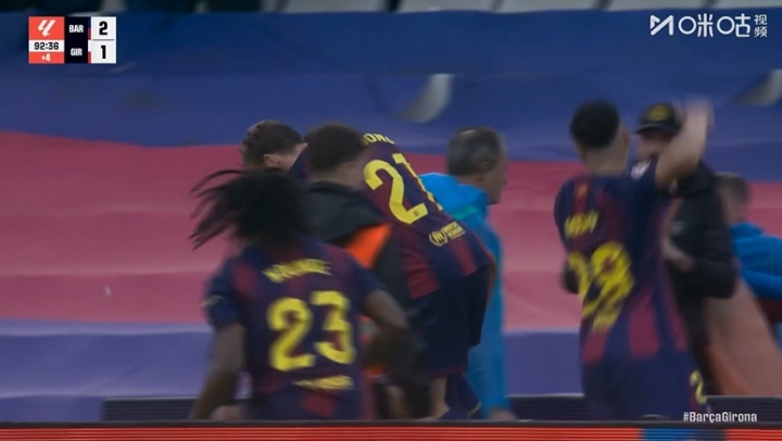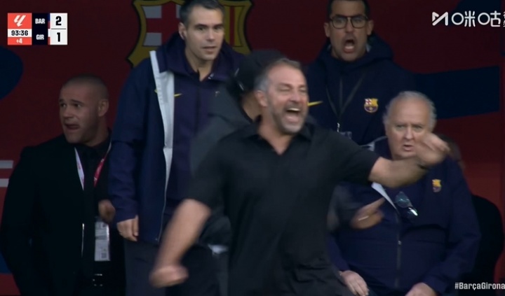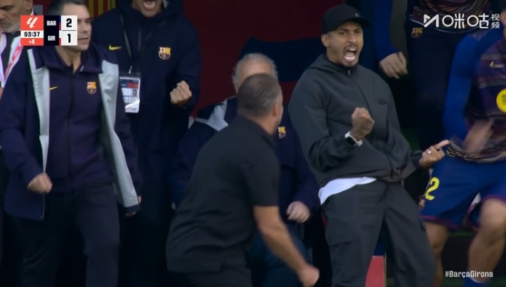 主帅弗里克、本场伤缺的拉菲尼亚在场边挥拳怒吼庆祝,此前替补下场的亚马尔也大笑着加入了庆祝的人群。