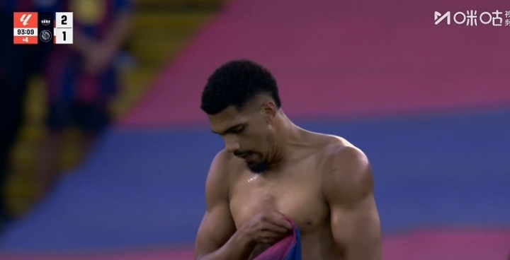 绝杀进球瞬间,阿劳霍激情脱衣庆祝,巴萨全队也陷入疯狂庆祝中。