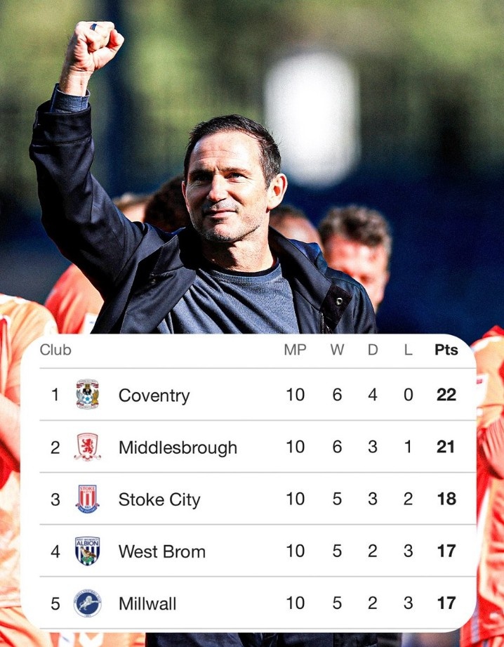 考文垂本赛季前10场英冠6胜4平保持不败,在积分榜上以1分优势领先米德尔斯堡位居榜首,球队10场比赛打进29球(联赛最多),只丢7球(已经连续5场零封)。