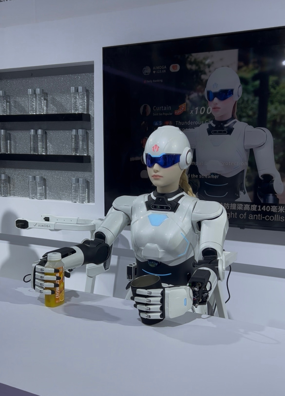 最后、科技感太强了。据奇瑞墨甲机器人副总夏鹏介绍,为本次大会服务的机器人墨茵就是奇瑞自主研发的,现在已经进入第二代,其能够自主进行学习。在现场,墨茵机器人可以为消费者从超市取拿物品,并且能够将饮料打开倒入杯中,并可以用手指去拉开车门,这已经不再是一代机器人输入指令执行的模式了,而是能够去主动学习技能。