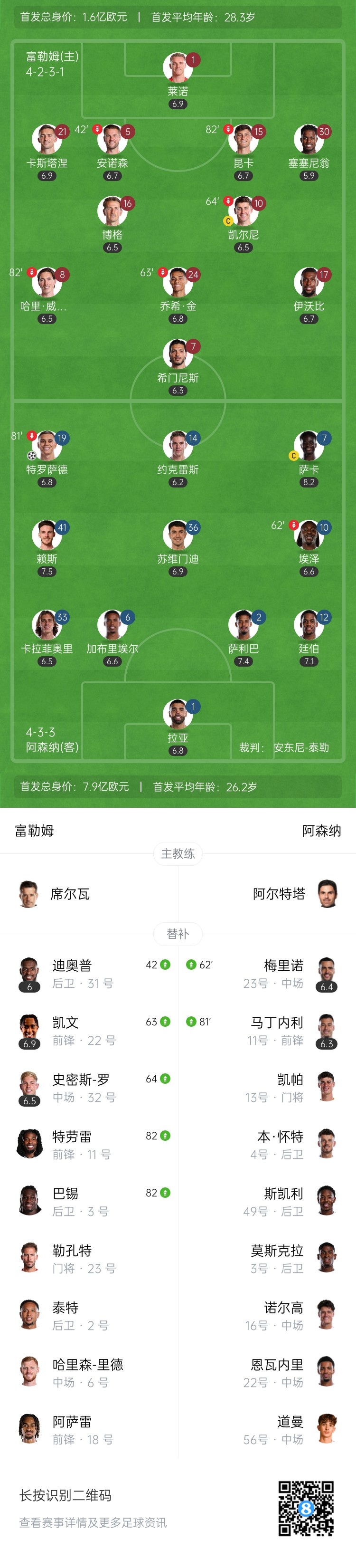 全场比赛结束,最终阿森纳1-0富勒姆。