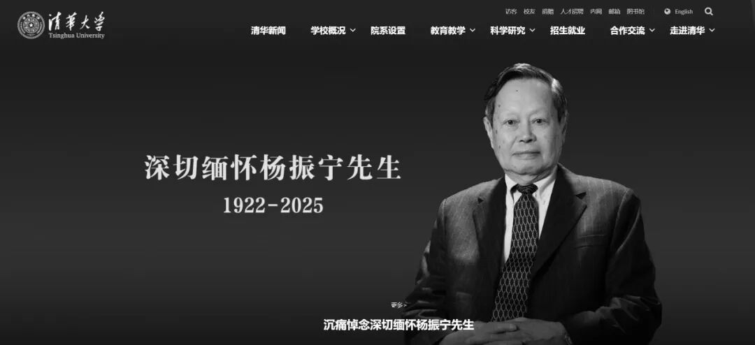 截止发稿,杨振宁生前履职的清华大学、西湖大学等高校的官网变成黑白色,十余所国内高校以及校长们发表文章,缅怀这位物理学泰斗。