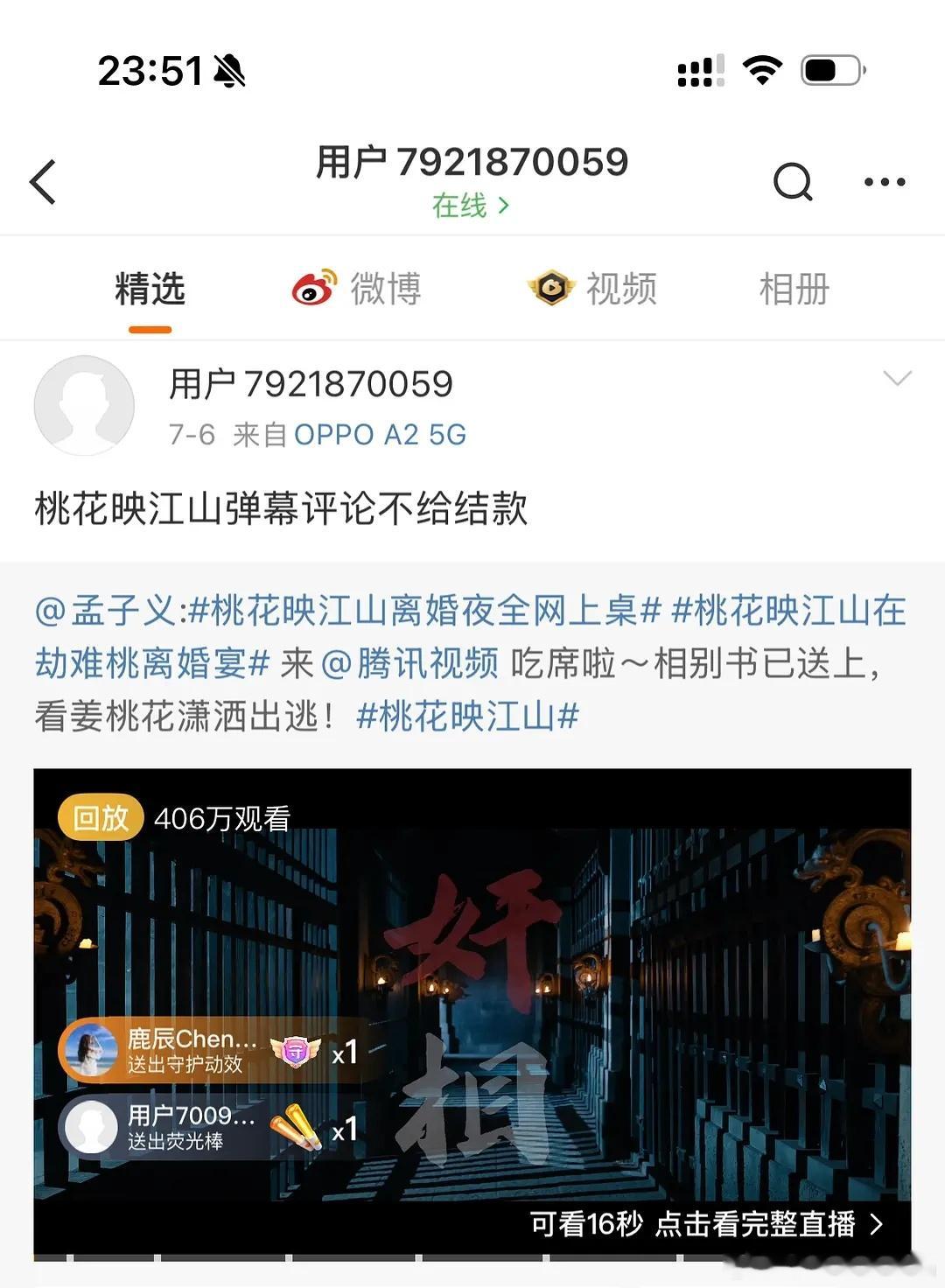 有网友反馈yhky不给结桃花映江山的弹幕的款。