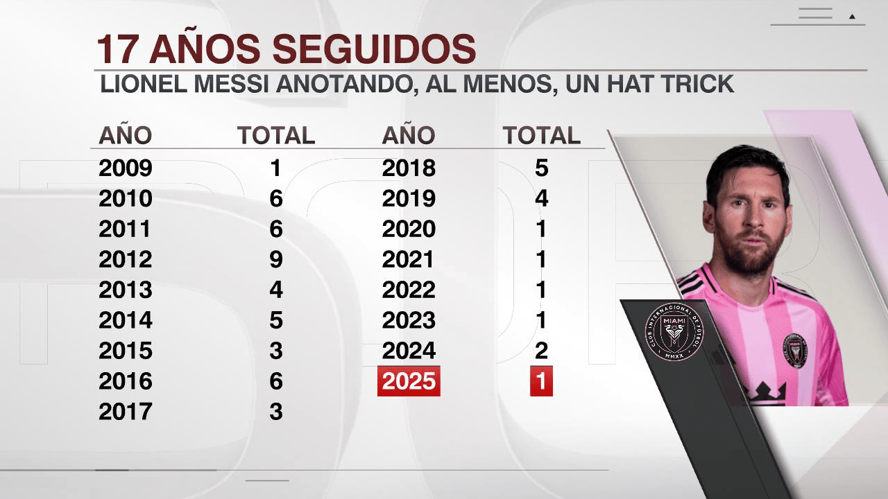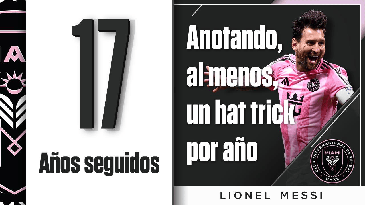 这是梅西今年的首个帽子戏法,他已经连续17年收获帽子戏法: