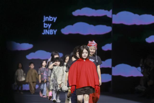 在上海时装周童装发布的聚光灯下,江南布衣旗下童装品牌jnbybyJNBY则作为开幕大秀,释放童趣纯真。以“太空邮递奇旅”为主题,jnbybyJNBY把秀场变成了超现实童话剧场。入口的圆润线条、核心区的“苹果门”装置,搭配化作动态绘本的LED星河,构建出可触摸的星际梦境。2025秋冬系列从“土豆星球”童话提取灵感,将叶子雨滴、熊掌热气球等元素融入卡其、红、灰三色设计,更通过“洋葱穿衣法”实现多场景穿搭,让童真与时尚在衣褶间绽放,为小朋友们打造了一场自由、希望与探索相互交织的时尚旅程。