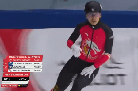 中国队虽率先完赛,但在滑行过程中碰撞对手犯规,最终被取消成绩。