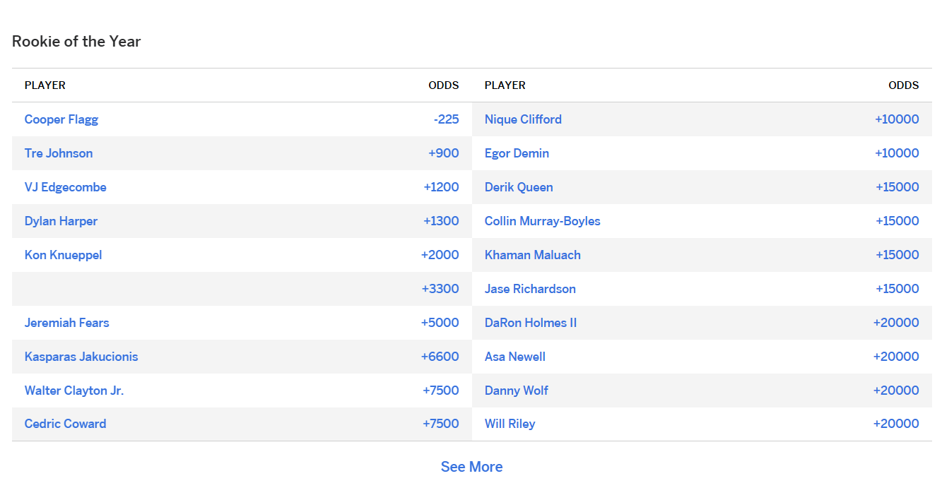 赛季开始前,ESPN更新了新赛季最佳新秀的赔率,具体如下: