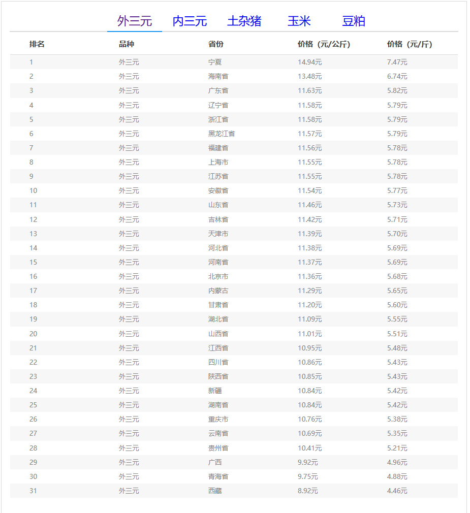 外三元排行前三:宁夏回族自治区14.94元/公斤、海南省13.48元/公斤、广东省11.63元/公斤;