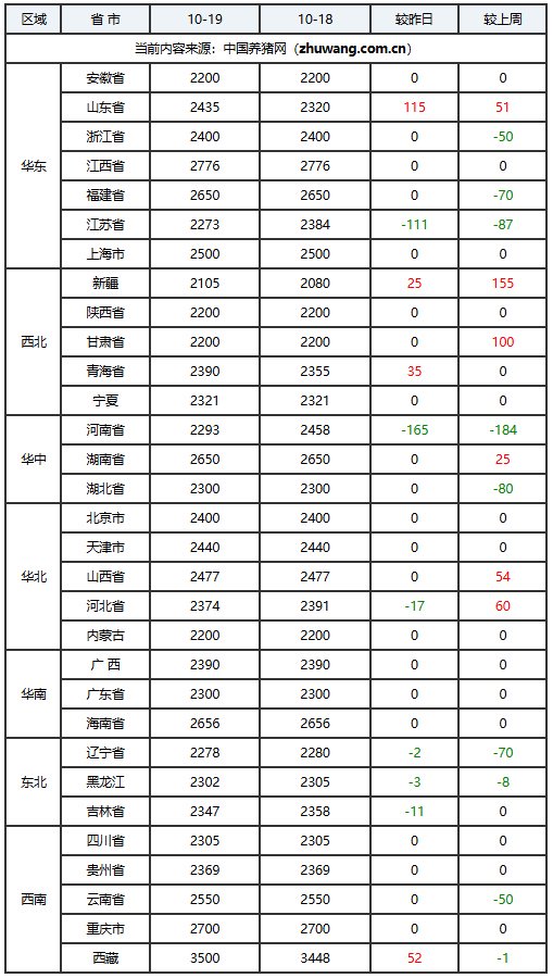 猪价上涨地区(12个):山东省、浙江省、江西省、福建省、新疆维吾尔自治区、甘肃省、河南省、湖北省、广东省、辽宁省、吉林省、重庆市;上涨区间:0.01-0.12元/公斤;