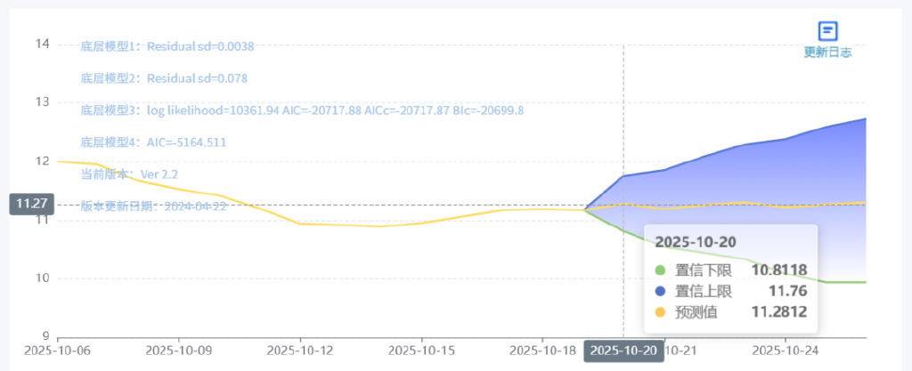 玄田算法是由项目课题组团队原创的非经典逻辑数值聚合理论和不确定性预测方法,构建了基于一致模算子的生猪价格预测模型。该模型采用的聚合函数及一致模相关理论与方法已获得多项国家自然科学基金和省级自然科学资金资助,并获得多项省级自然科学奖奖项。10月20日预测猪价为11.2812,置信区间在10.8118--11.76之间。10月21日预测猪价为11.1913;10月22日预测猪价为11.2608。