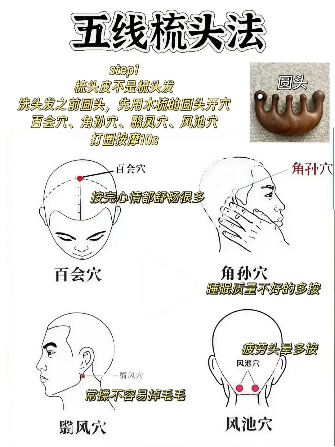 1️⃣洗头发之前先用木梳的圆头开穴,百会穴、角孙穴、翳凤穴、风池穴打圈按摩10s