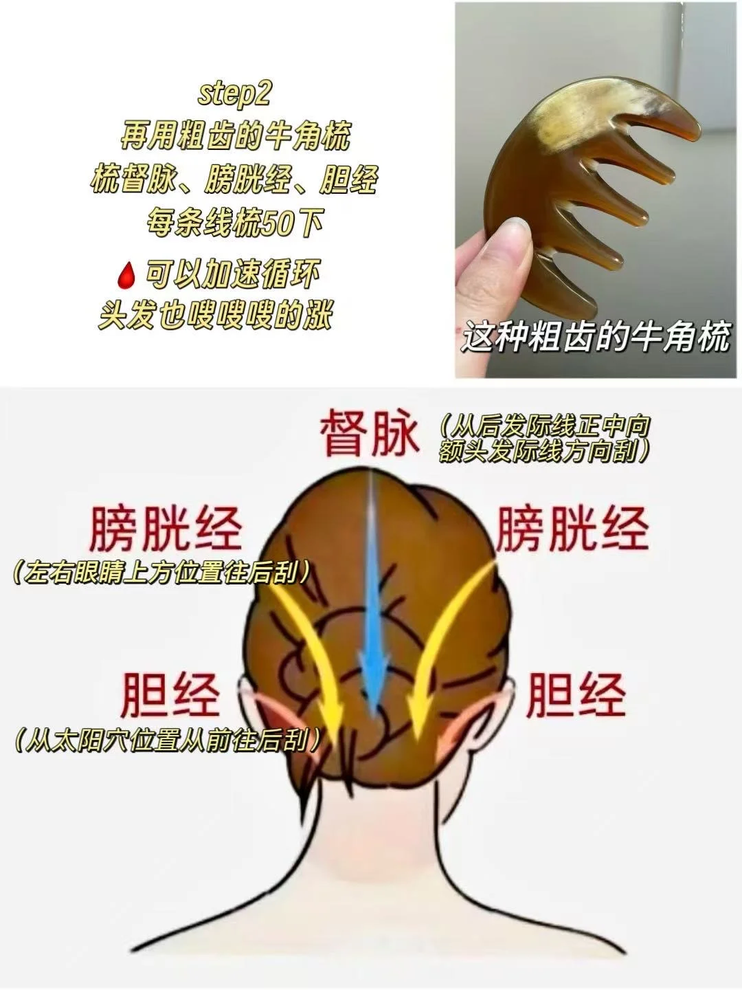 2️⃣再用粗齿的牛角梳梳督脉、膀胱经、胆经,每条线梳50下,可以促进头皮的循环,让头发噌噌长(具体方法总结到图里了👆