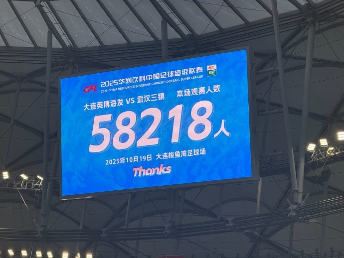 今天下午,大连英博在中超第27轮主场对阵武汉三镇,本场比赛到场观众人数为58218人。