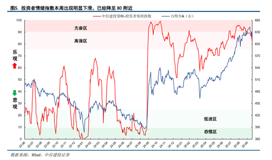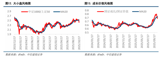 我们构建并持续跟踪的投资者情绪指数9月底开始有所下滑,9月30日跌破亢奋区发出右侧卖出信号,节后两个交易日未能明显回升至90上方,右侧卖出信号得以确认。本周情绪指数进一步下滑,截至周五已经降至80附近,市场情绪明显降温,科技成长板块明显调整、价值红利风格则表现较好。