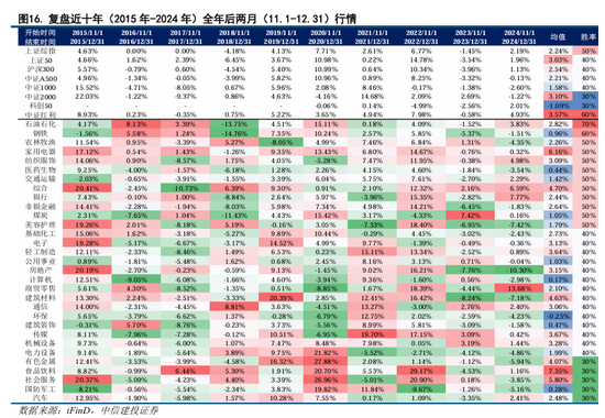 年底盈利多兑现,大盘价值风格往往占优。通过复盘近十年全年后两个月(即2015年至2024年每年11月1日至12月31日)A股行情,我们可知:受“盈利兑现、落袋为安”的需求影响,中证红利指数及上证综指表现较优;行业结构上,红利及大盘价值风格往往占优,石油石化/钢铁/煤炭等红利板块,以及银行/非银金融等金融板块胜率较高。