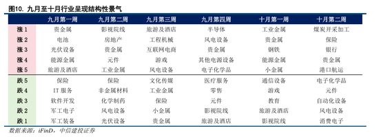 行业结构性景气驱动行情。从九月至十月的行业表现来看,市场动能主要由部分景气板块轮动驱动,例如贵金属、风电设备等行业多次出现在涨幅前列,显示出持续的资金关注度;而保险、医药等板块则持续承压。当前市场行情并非由整体行业普涨推动,而是受特定行业供需变化、政策预期或事件性因素等影响,呈现出结构性行业景气格局。
