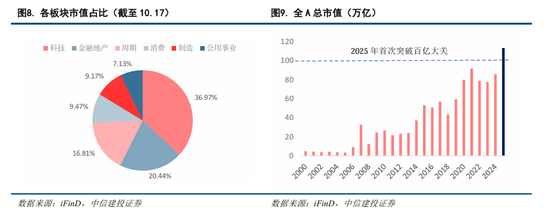 资本市场“量质齐升”态势显著。1)截至10月17日,A股总市值达113.02万亿元,较“十三五”末增长35.51%;目前,我国债券市场规模居全球第二位,期货成交量稳居全球第一位,资本市场的广度和深度得到显著提升;2)市场结构优化在市值分布上体现得尤为明显:目前A股科技板块市值占比超四分之一,已明显高于银行、非银金融、房地产行业市值合计占比。市值前50名公司中,科技型企业从“十三五”时期末的18家提升至当前的24家。