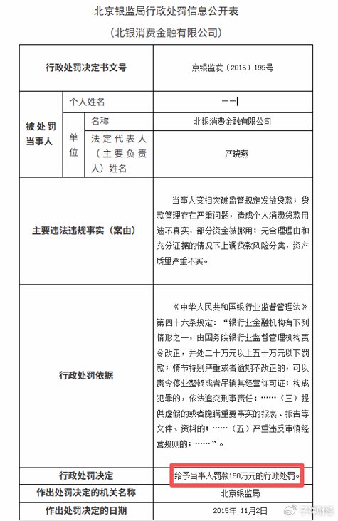 此前在2015年11月,原银监会因北银消费金融涉嫌通过合作公司“拉人头”骗贷,即贷款客户并非实际资金使用人,对其开出150万元罚单。